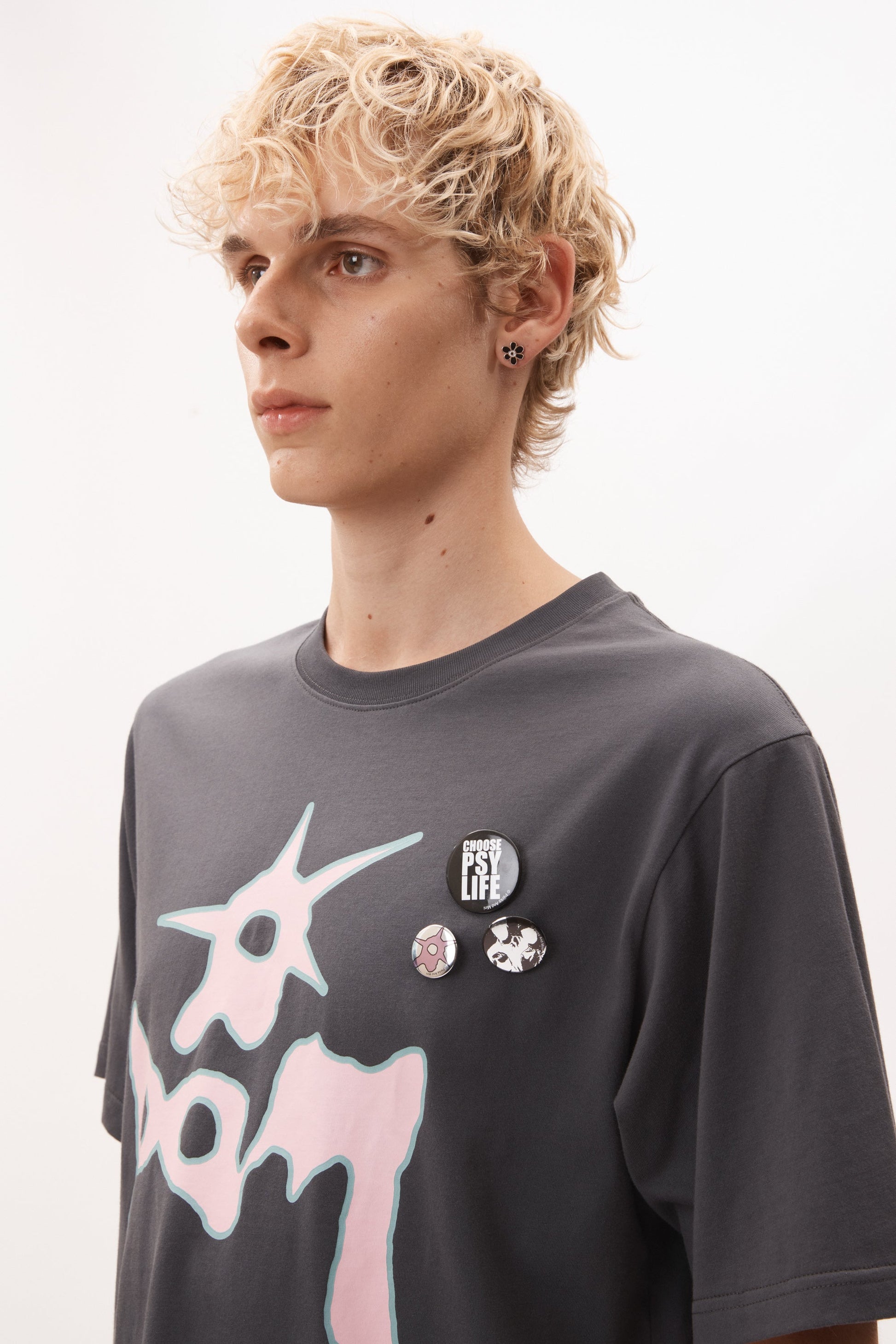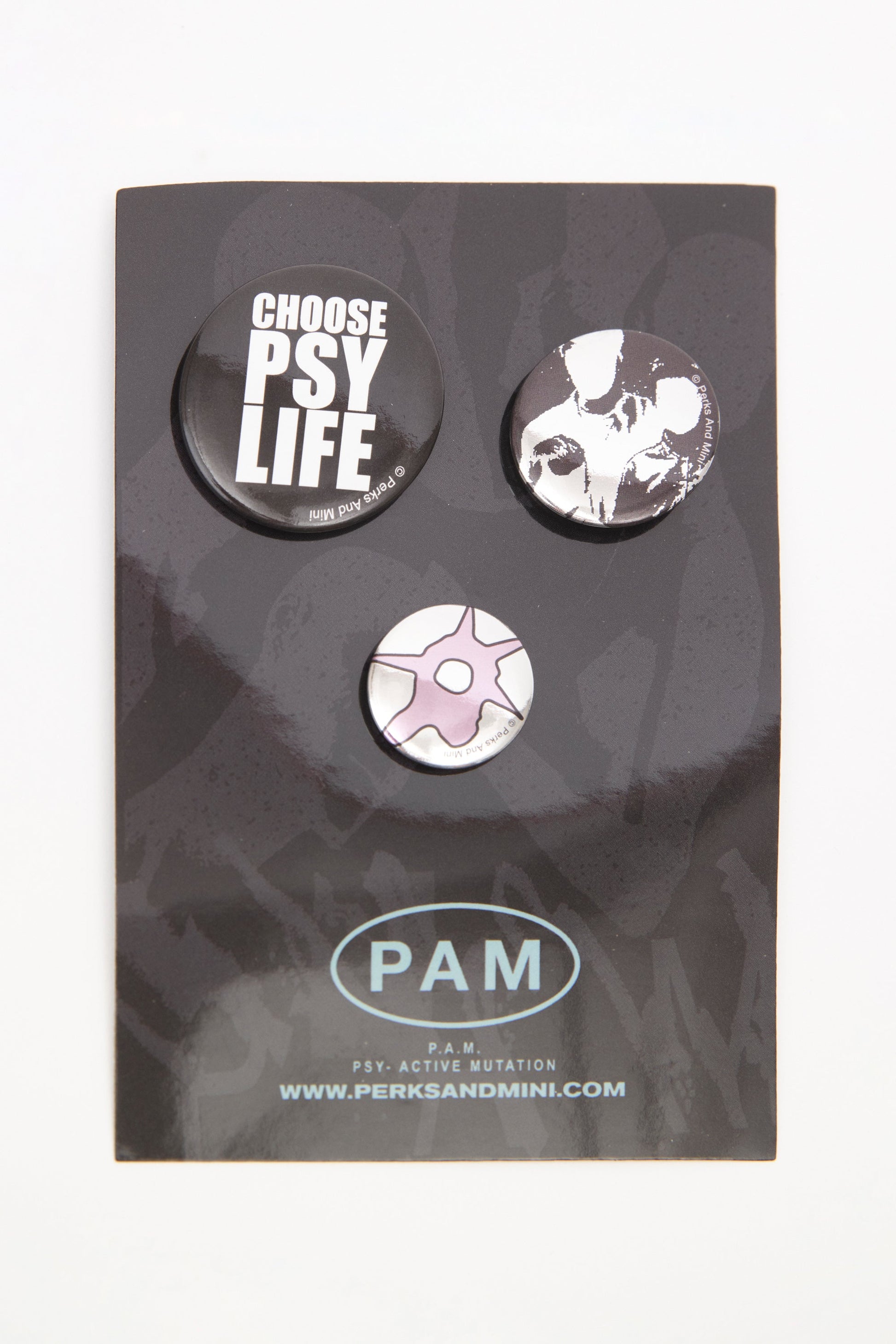 - 3 pc pin badge set with various 'P.A.M' logos and designs.
