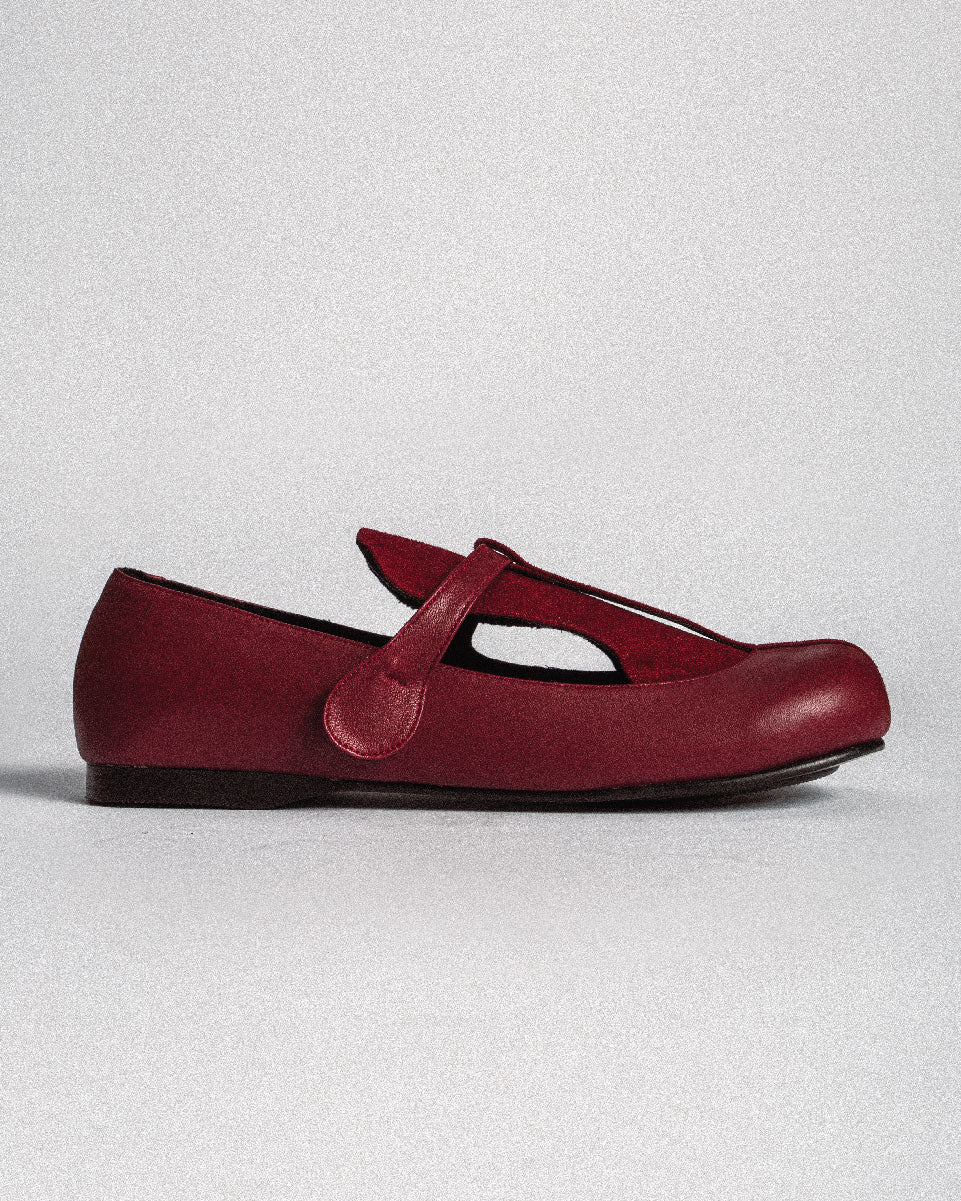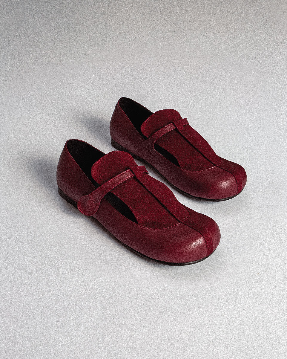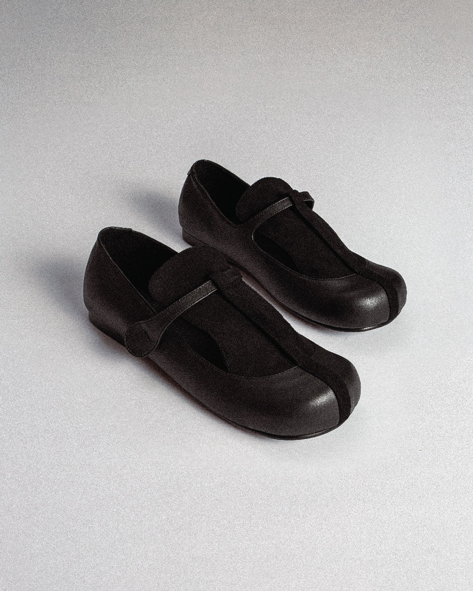 A rounded toe flat shoe crafted in genuine leather featuring a t-bar mary jane upper with a suede tongue.